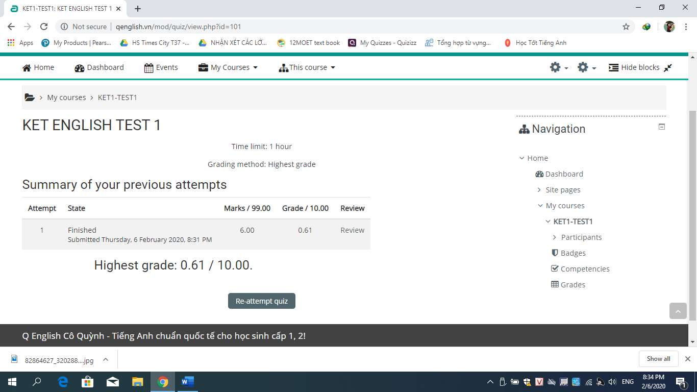 Học sinh có thể làm lại bài bằng cách chọn Re-attempt quiz. Các câu hỏi có thể được xáo trộn thứ tự để HS luyện tập.