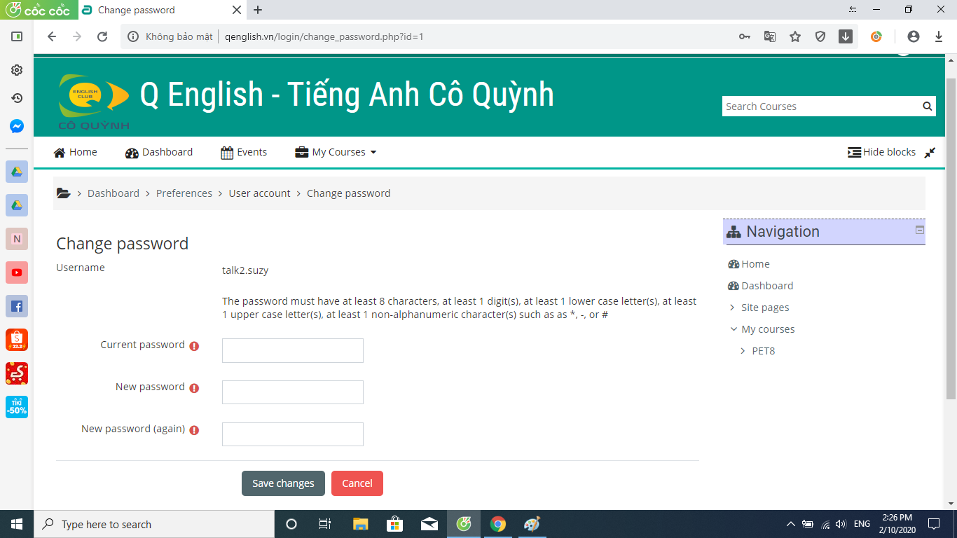 Click vào: Preference và chọn: Change Password thì sẽ ra màn hình đổi mật khẩu như sau:
